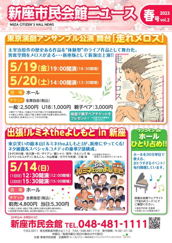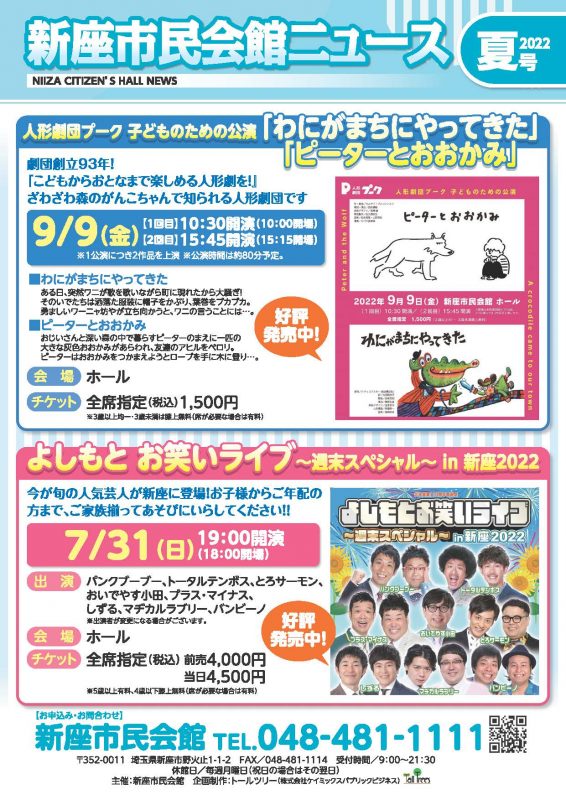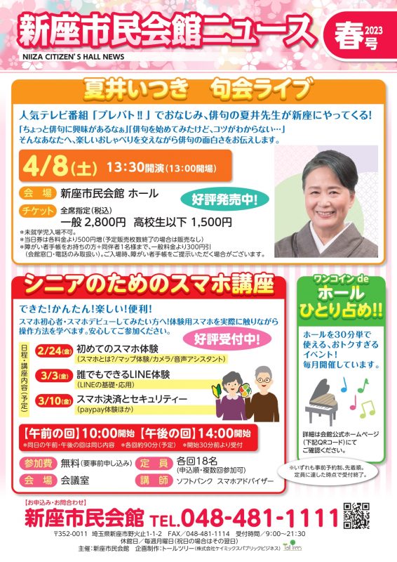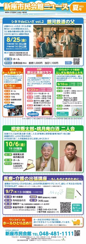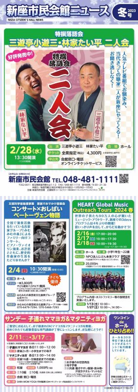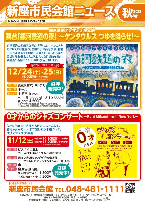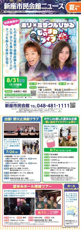 最新号 2024年 2024年 秋号 市民会館ニュース 2024年秋号 最新号のPDFはこちら バックナンバー 2016年 冬号 7月号 2017年 夏休み号 春号 2018年 秋号 夏休み号 2019年 冬号 秋号 2021年 新春号 冬号 夏号 2022年 秋号 夏号 2023年 冬号 夏号 春号vol.2 春号 2024年 2024年 秋号 2024年 夏号